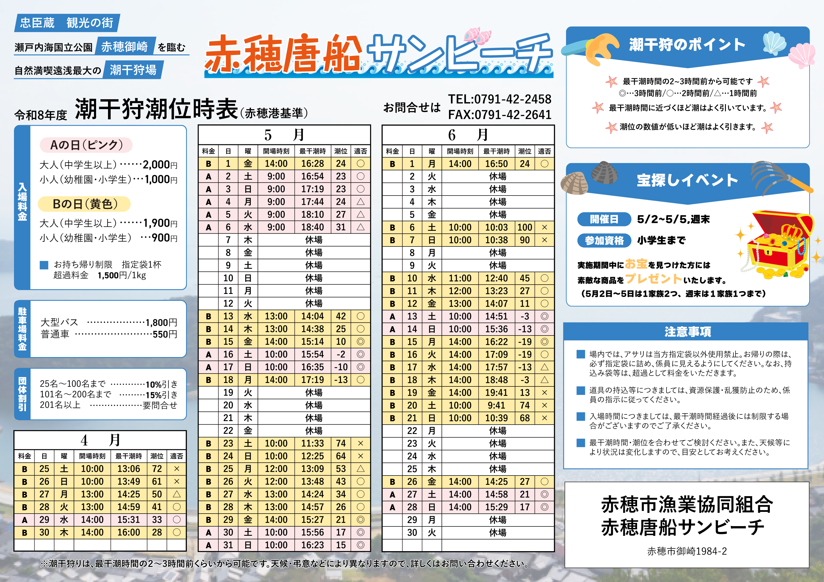 | 開場時間 | 赤穂潮干狩潮位時表を確認 |
